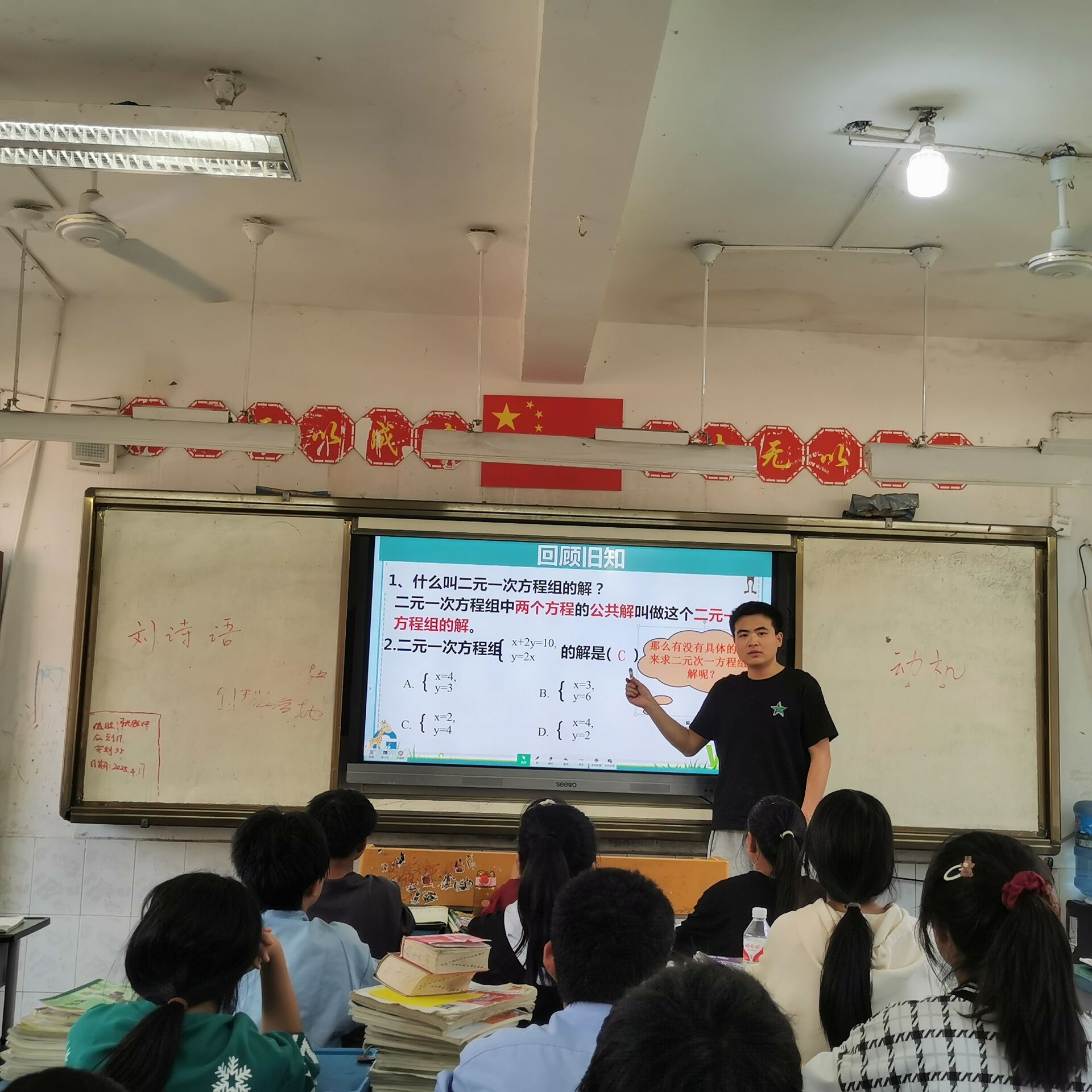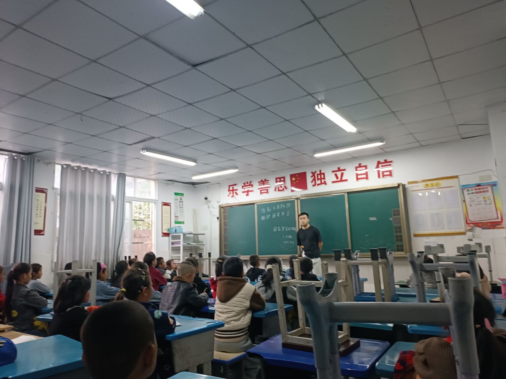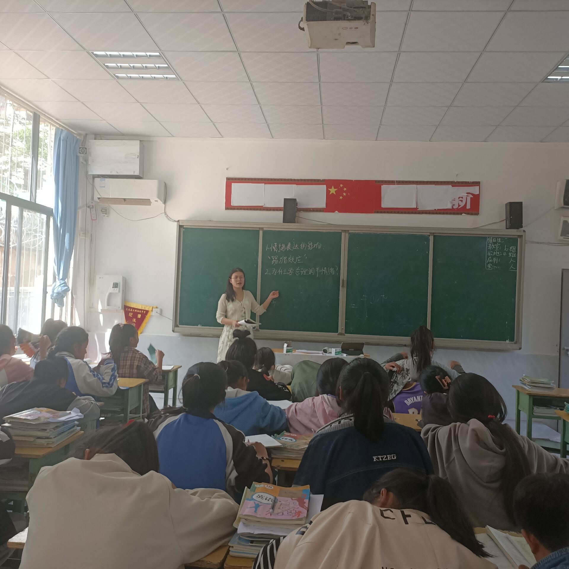 来到这里的第二天,我就领到了一张课表,是带4个初一班级的政治课。第一堂课,我忐忑不安地走向讲台。第一句话是,“大家好,我是吴.....”下面50几双眼睛齐刷刷地望着我,然而由于我过于紧张突然卡壳,本来准备好的话哽在喉咙里,只能挤出一句“今年22岁”。说完后我满面通红,学生们哄堂大笑……第一节课就这样非常尴尬的结束了。非常沮丧的我询问了一同来支教的同学,学习他们是如何与学生相处的。在同学处积累到经验后,我接着去上第二个班级、第三个班级的课,就取得了不错的效果。