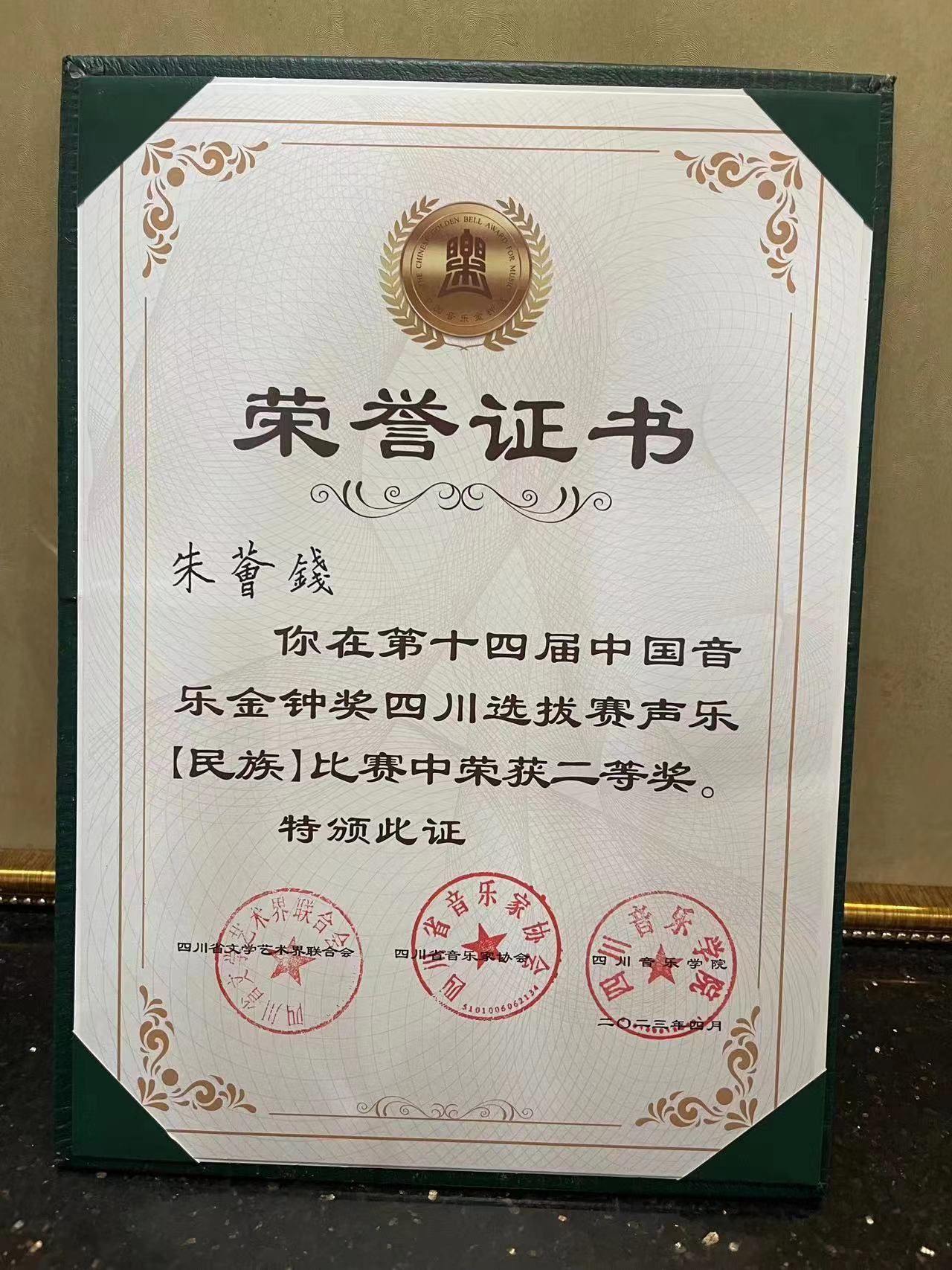 本网讯(文、图/朱荟钱)在刚刚结束的由中国文联和中国音协共同主办的中国音乐专业大奖——第十四届中国音乐金钟奖四川选拔赛声乐比赛中,音乐学院青年教师朱荟钱历经五场赛事的层层选拔以及决赛的激烈角逐,一路“过关斩将”,最终以全省第四名的好成绩,摘得民族组银奖,挺进全国总决赛!