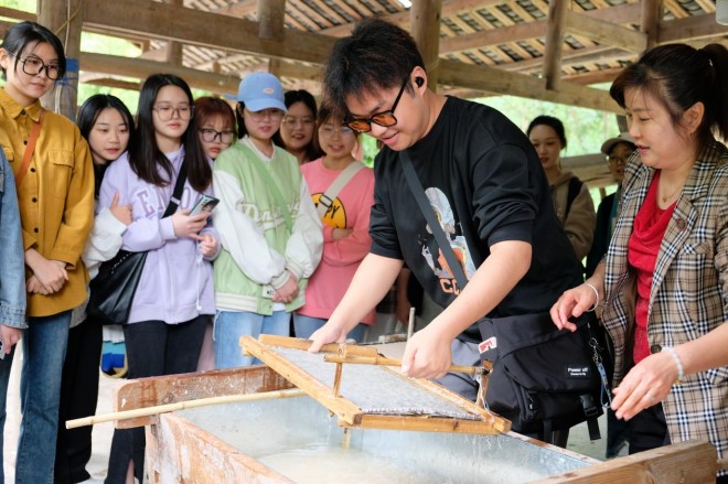 随后,师生党员全程观看、体验了竹子到竹浆再到纸张的过程,纷纷体验了古法造纸 72 道工序之“舂以臼”、“抄以簾”、“刷以壁”。另外还了解了国家级非物质文化遗产夹江年画的起源与发展,并逐一进行年画的印制涂色制作。进一步感受了中华民族光辉灿烂的文化。