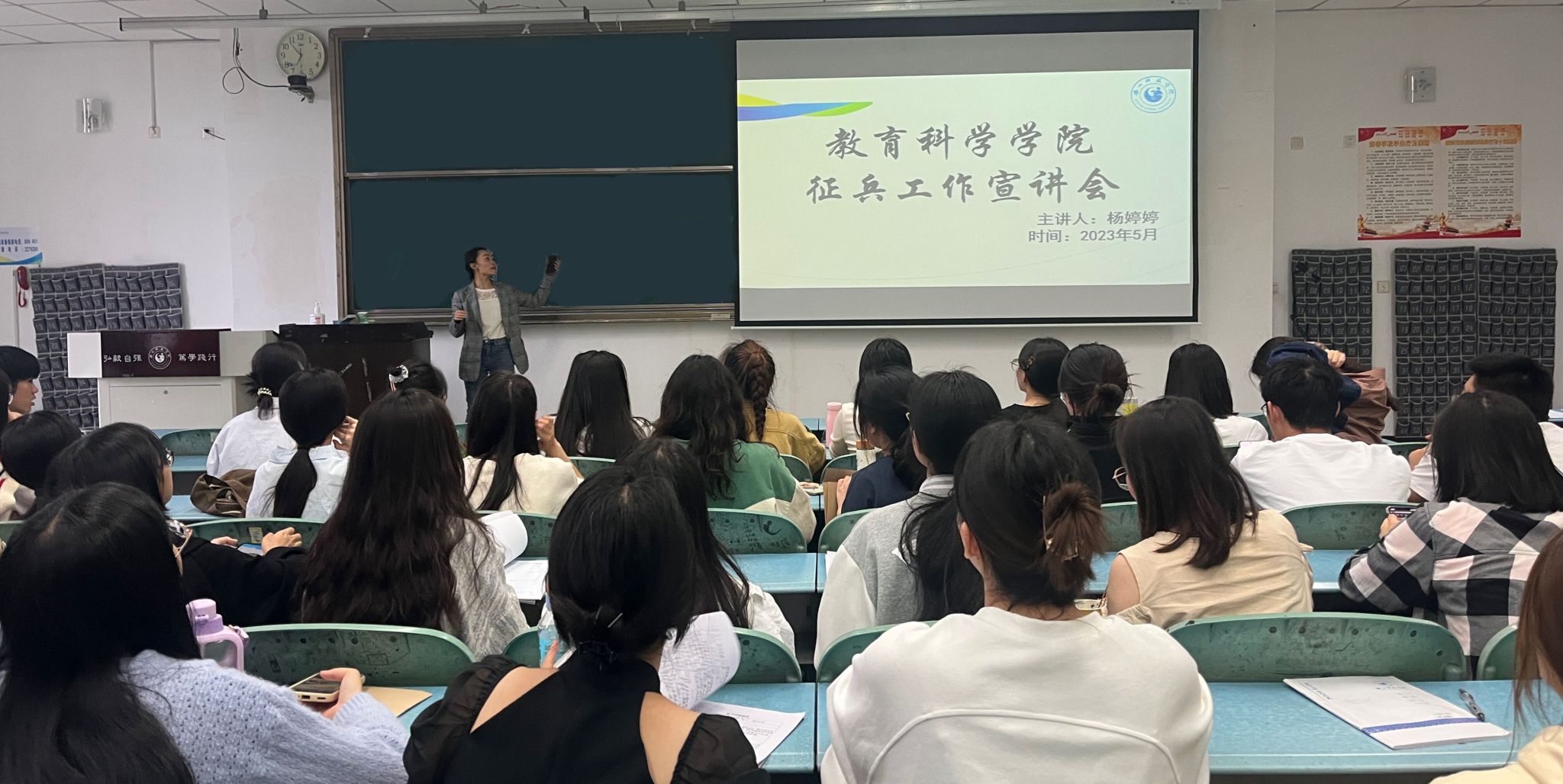 本网讯(文、图/贾琪)为鼓励学生积极应征入伍,推动学生了解应征入伍政策,5月22日晚,教科学院在行知楼101教室开展了大学生应征入伍政策宣讲。