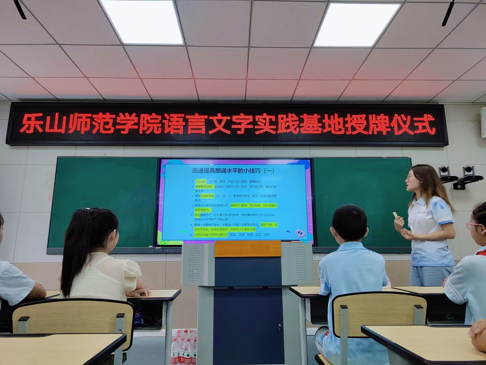 授牌仪式完毕,来自世界杯葡萄牙vs加纳波胆预测 的三位志愿者老师周雪、陈怡洁、李奕伶为在场的同学带来了一堂生动有趣的普通话学习课堂。首先志愿者老师们依次进行了自我介绍,并通过一场“破冰游戏”以此来增进同学们和志愿者老师间的了解,志愿者老师主持大家一起玩一个名叫“听到水果请举手”的游戏,教室里撒下同学们一阵欢快的笑声。为了勾起同学们对之后课程的兴趣,课程还设置了绕口令大pk,同学们踊跃参与,和同伴们一起完成了一场精彩的绕口令比赛。来自汉语国际教育专业的志愿者周雪发挥特长,她使用标准的普通话,示范朗读绕口令,并用专业知识教授同学们如何练习绕口令并展示朗读技巧,向学生们展示普通话的魅力。最后,志愿者老师陈怡洁带领同学们深情朗读《彩色的中国》,同学们神采奕奕,抑扬顿挫之间把对祖国的爱展现得淋漓尽致。本节课堂循序渐进,充满趣味,同学们激情饱满,积极互动,在场同学和老师都沉浸在一种轻松愉悦的氛围之中。课程结束时,三位志愿者老师分别对同学们送上寄语,鼓励同学们认真学习。