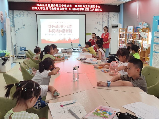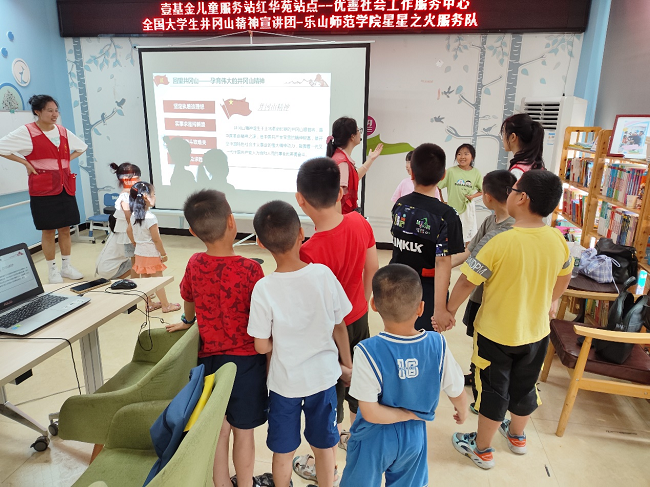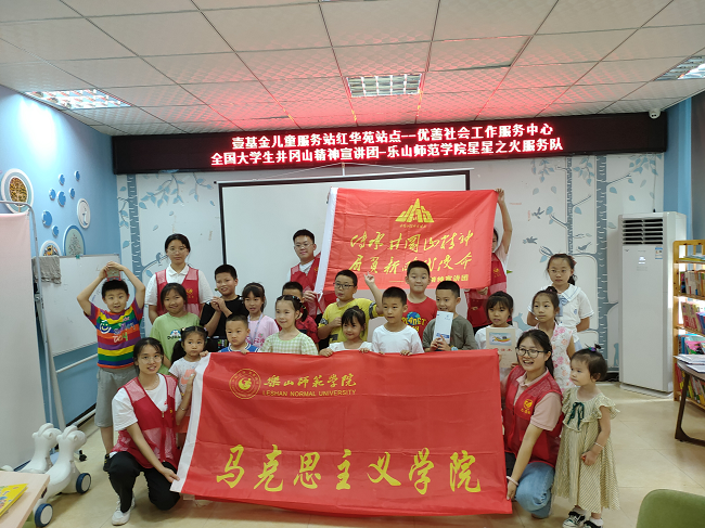 本网讯(文/陈美美、图/陶天法)风雨红旗世代扬,革命精神代代传!为深入弘扬井冈山精神,激发少年儿童爱国主义情怀。7月11日上午,由我校马克思主义学院和旅游与地理科学学院组成的全国大学生井冈山精神宣讲团队——乐师星星之火服务队,到峨眉山市绥山镇红华苑社区壹基金儿童服务站进行井冈山精神宣讲。本次活动时长共60分钟,共服务站点学生18余人。