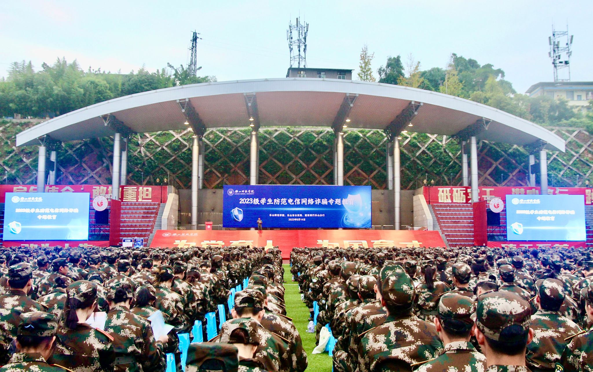 本网讯(文图/薛小丽)为进一步强化校园反诈宣传力度,增强我校师生反诈防骗意识,有效预防和遏制电信网络诈骗案件发生,构建安全和谐的校园环境,9月14日,我校携手乐山市公安局反诈中心和中国建设银行乐山分行,在北校区运动场为2023级4000名新生开展了防范电信网络诈骗专题教育活动。活动由党委武装保卫部副部长罗智勇主持。