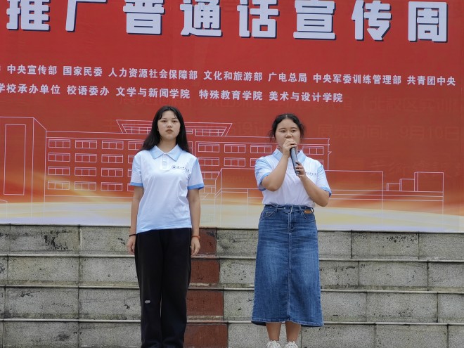推广普通话,师生齐行动。本次活动,首先由特教学院为大家带来手语展示,再由文新艺术团为在场老师和同学表演朗诵《献礼二十大,颂歌献给党》和带来歌曲《字正腔圆》。这些表演以生动有趣的方式让同学们了解到了普通话普及的重要性,也将活动氛围推至顶点。在活动现场共设置了四大板块。首先是普通话推广风采展示板块,该板块共有四个风采展示位,其分别由来自马边、峨边、张村、蓬溪的四个推普队伍为在校师生介绍暑期推普成果。这不仅展示了我院暑期实践活动成果,更激发了广大学生对普通话推广的积极性。其次是普通话游戏板块,该板块共设两个展示位。展示位前人来人往,同学们积极挑战着“异读词”和“平仄韵心间”,“一平一仄”表现出了同学们对推广普通话的热情和对普通话的认可度。除此以外,本次活动还设置了抽奖处,抽奖处的设立使得同学们参与活动的积极性高涨,推动了活动良性进行。