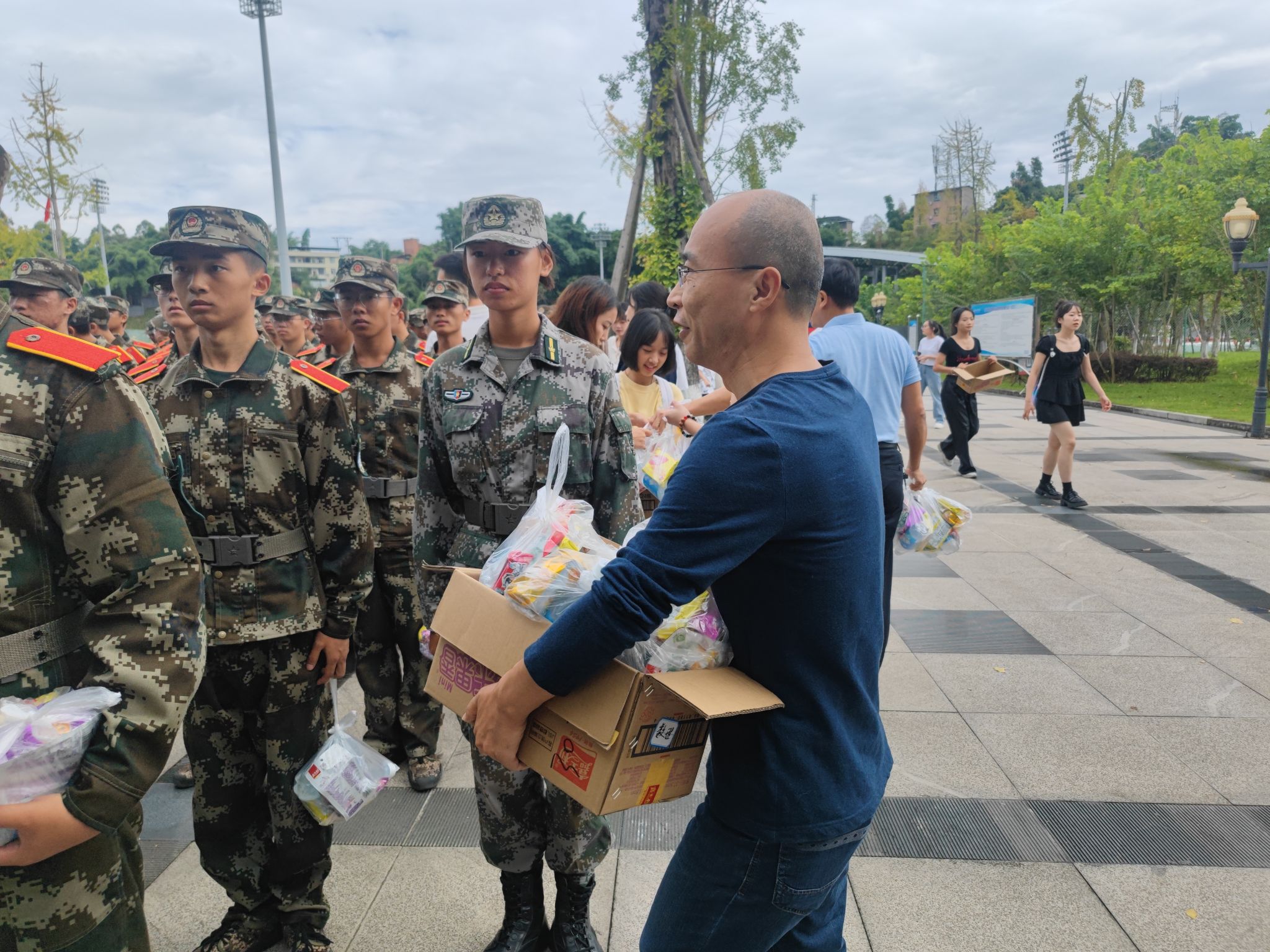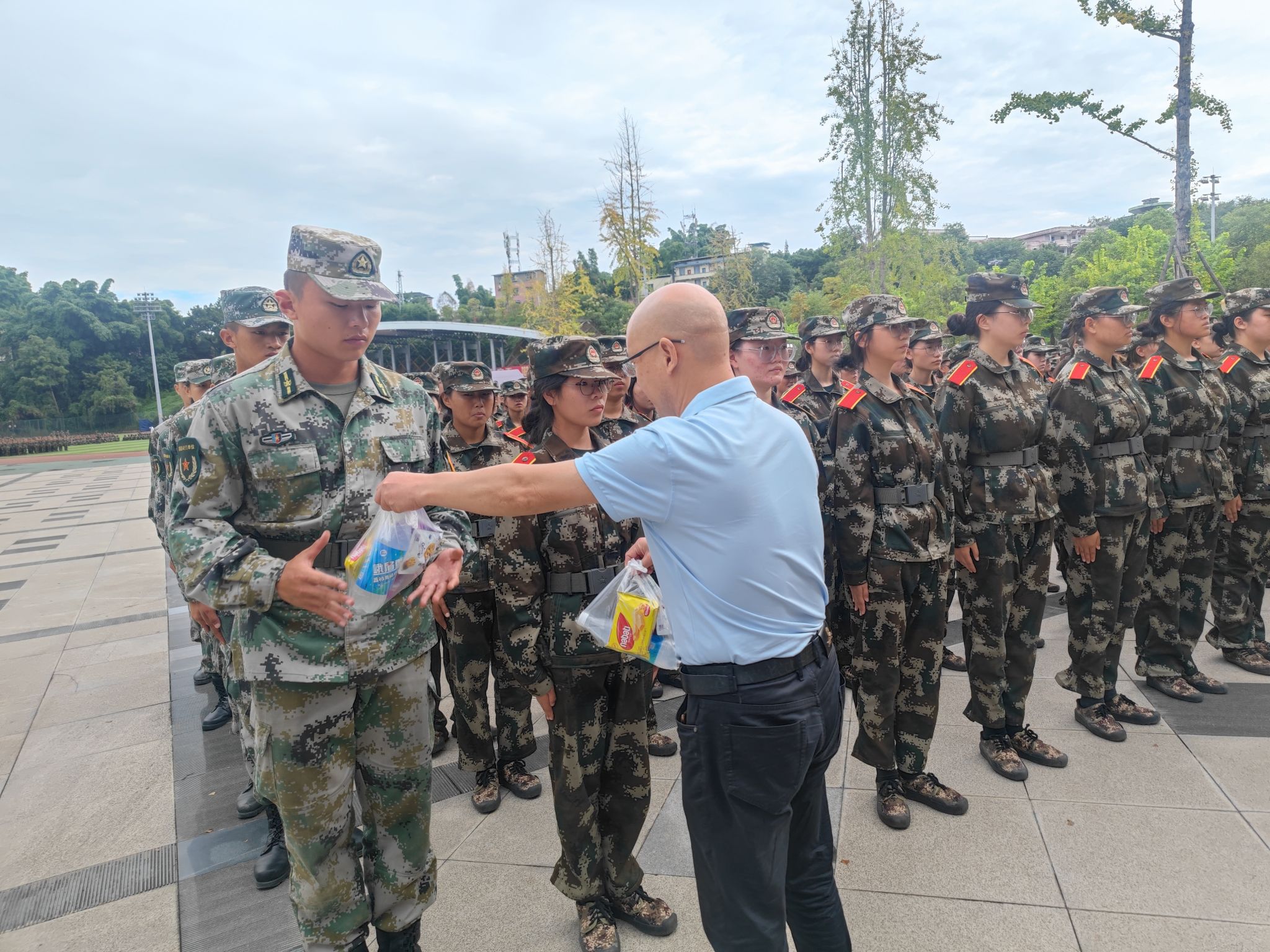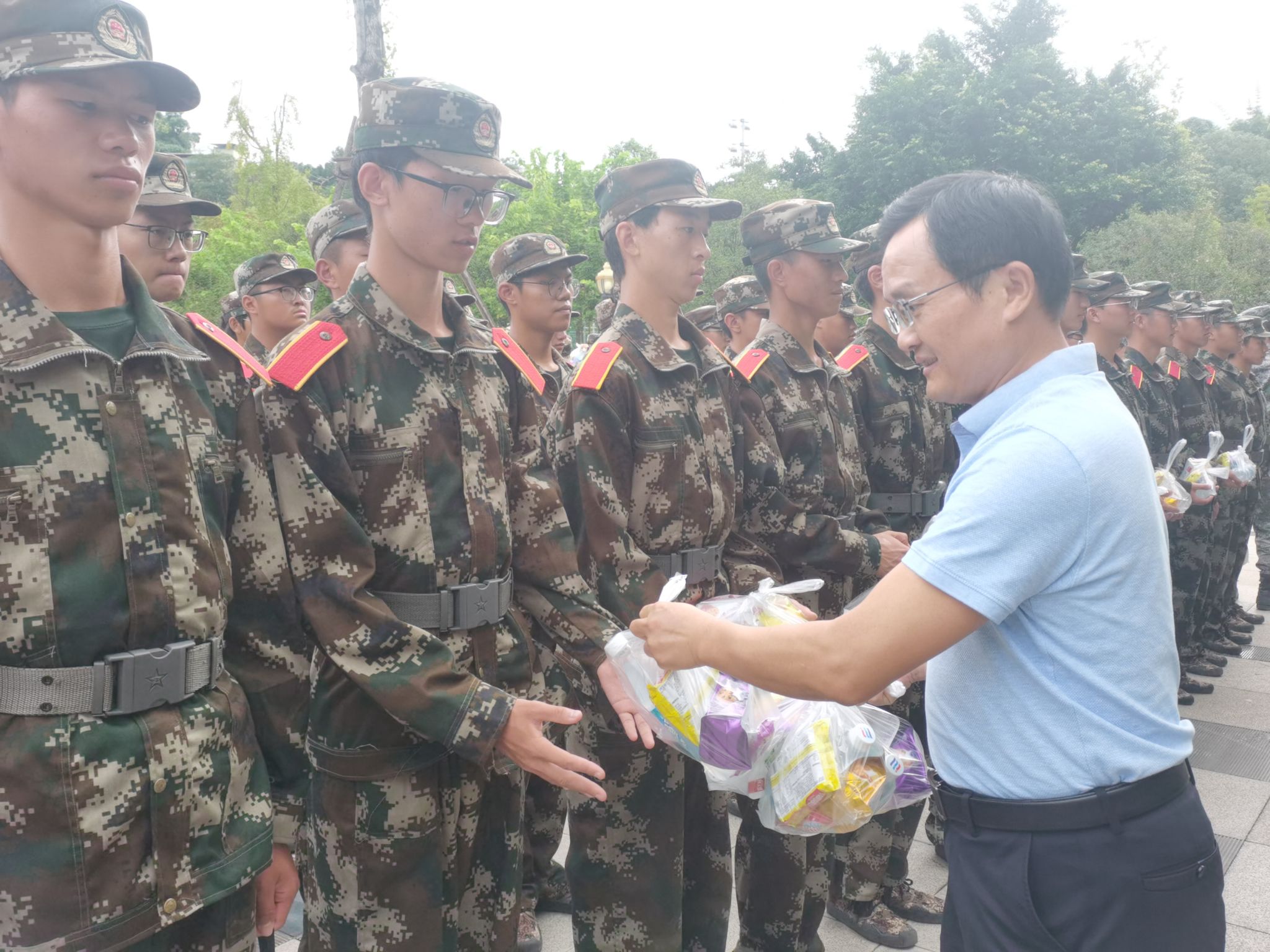 新生列队整齐,步伐坚定,用坚定的意志展现了数理学子不畏艰难和昂扬向上的精神风貌。学院领导对参加军训的同学们表达了赞赏,鼓励同学们要发扬不怕吃苦、艰苦奋斗的精神,通过军训历练规矩意识和纪律意识,团结协作,争创佳绩,为顺利完成四年大学生活奠定坚实的基础。老师们和师兄师姐们为新生送来了“爱心零食礼包”,给正在军训的同学们加油打气。秋风微凉,但每一份礼物都透露着浓浓的温情,让在场的同学们和教官们都感受到了深深的温暖与关怀。