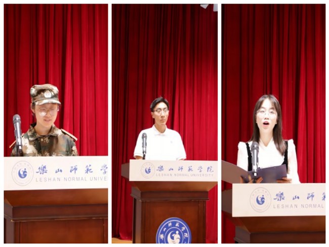 典礼上,2008级优秀校友龙海东以自己在母校的求学和创业经历,鼓励同学积极参加各级各类活动,朝着自己设立的目标,以充实而有意义的方式度过大学时光。2020级生物科学专业陈雨苇代表高年级的学长学姐们鼓励新生要充分利用大学时光,在专业、学生工作、社会实践等方面拓展自己,明确奋斗目标,成就人生梦想。2023级新生代表田静和2021级专升本学生次真曲批分别表示将会珍惜大学时光,在乐师的舞台上奋力拼搏,争做新时代新青年。