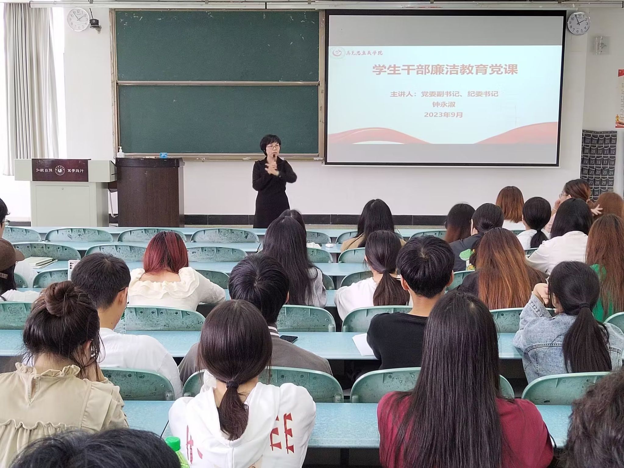 本网讯(文/曹雨彤 图/李晨、罗雅欣)9月27日中午,马克思主义学院于行知楼201教室开展学生党员和学生干部廉洁教育党课活动。本次活动由党委副书记、纪委书记钟永淑主讲,21级、22级全体党员与学生干部参与。