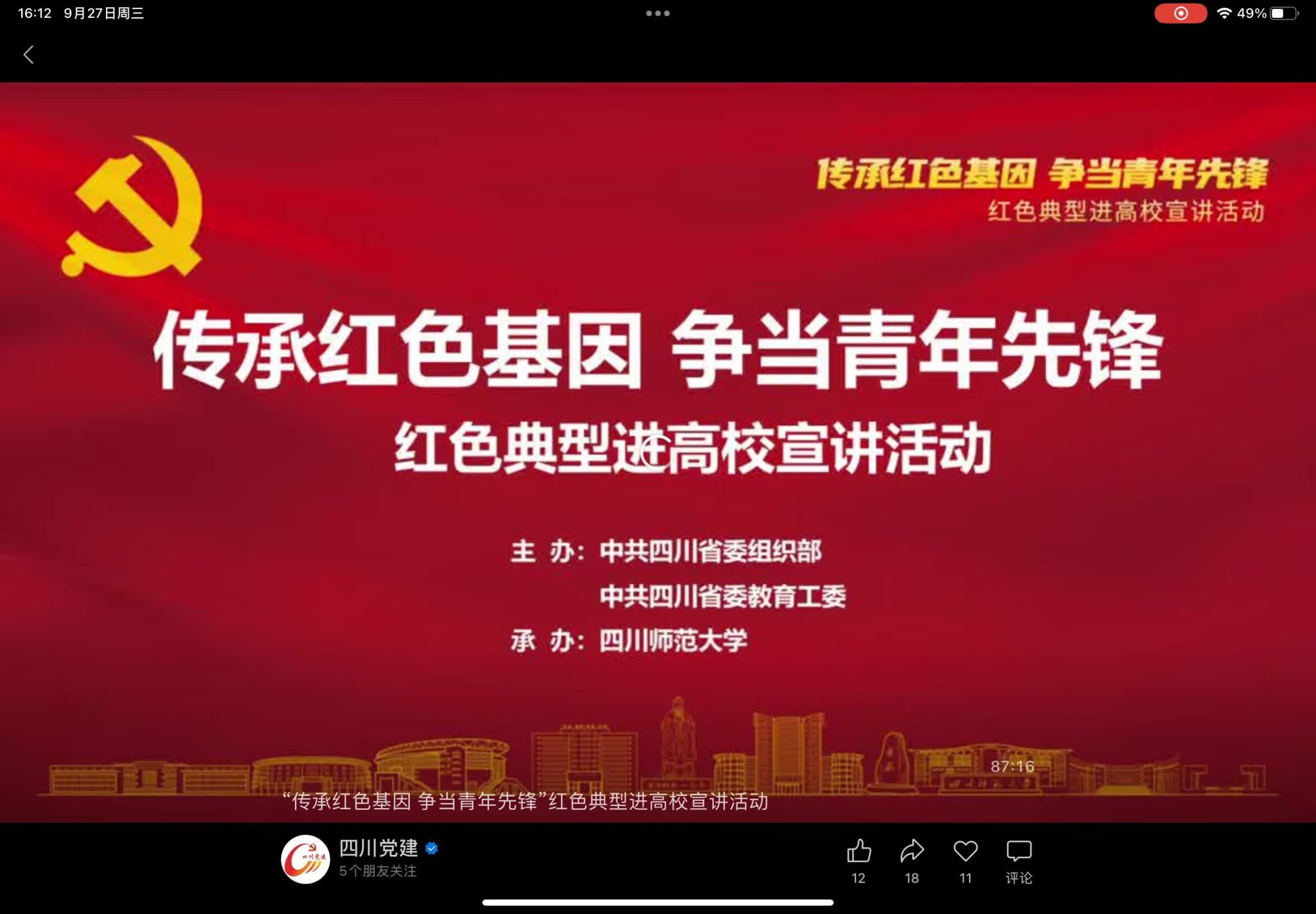观看本次宣讲活动直播让全体师生更加坚定了自身信念,“红色基因”是我们中华民族的精神纽带,是中国共产党人的精神内核。作为新时代的接班人,我们要“铭记历史,展望未来;要勇于拼搏、迎难而上,继承中华民族的光荣传统,爱党爱国,矢志不渝;要不忘历史之痛,心怀强国之志,树立永远听党话、跟党走的坚定信念,让红色的基因传承万代千秋。
