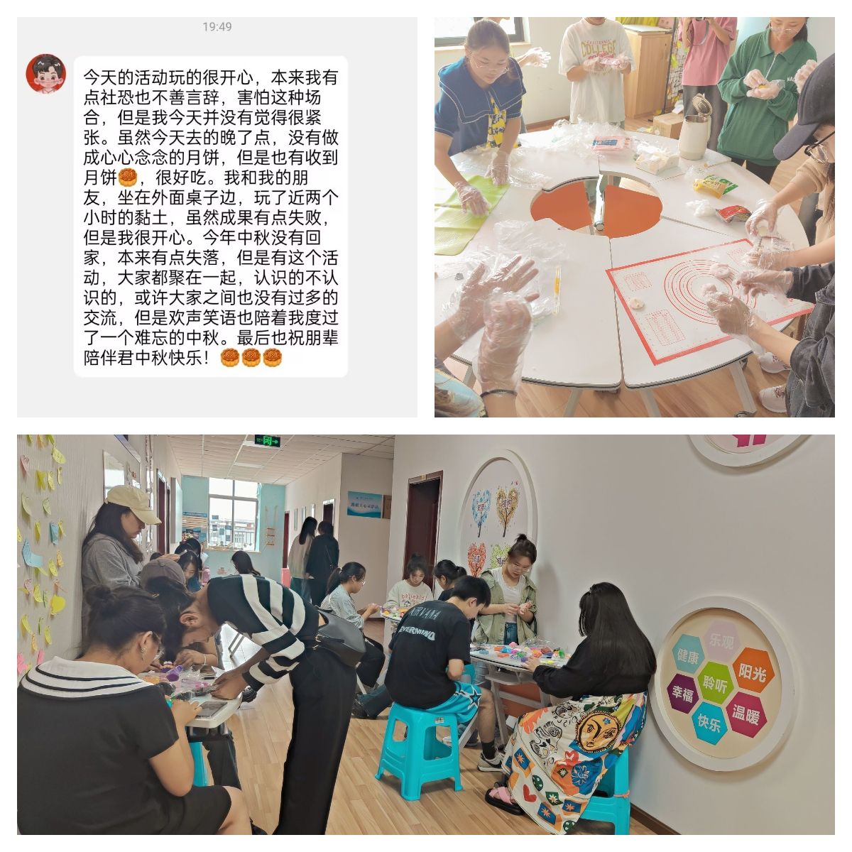 此次活动着重酝酿中秋佳节的氛围和格调,弘扬中华传统文化,同时,充分展现了朋辈自助、互助、他助的良好精神风貌,陪伴同学们度过了一个难忘的中秋佳节,在感念亲情、学会珍惜、永葆感恩中提升心理素养和人格品味。