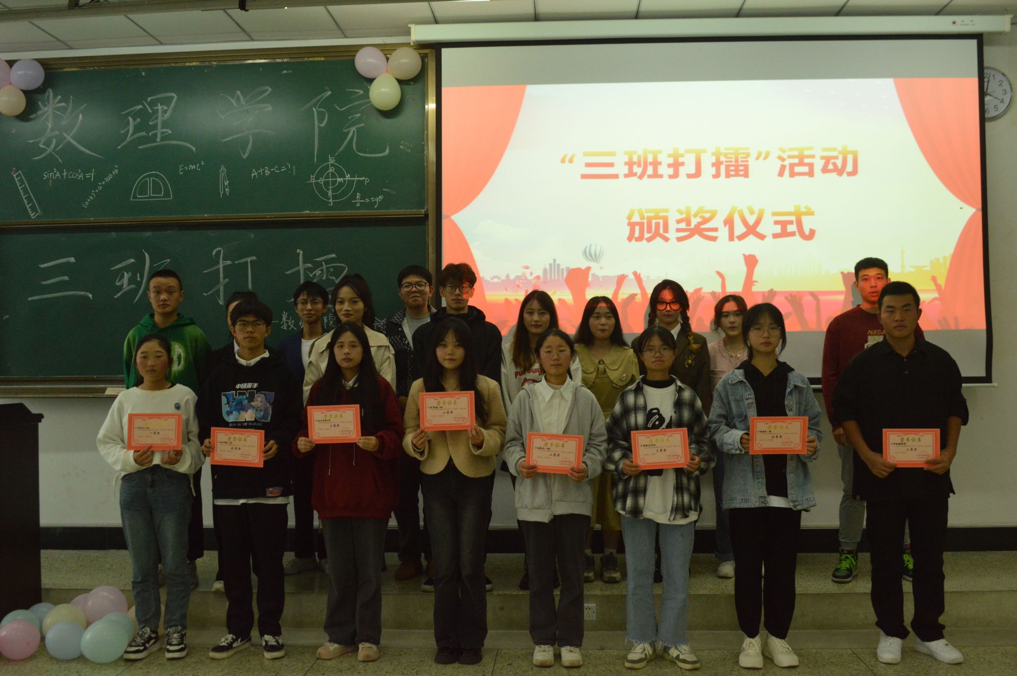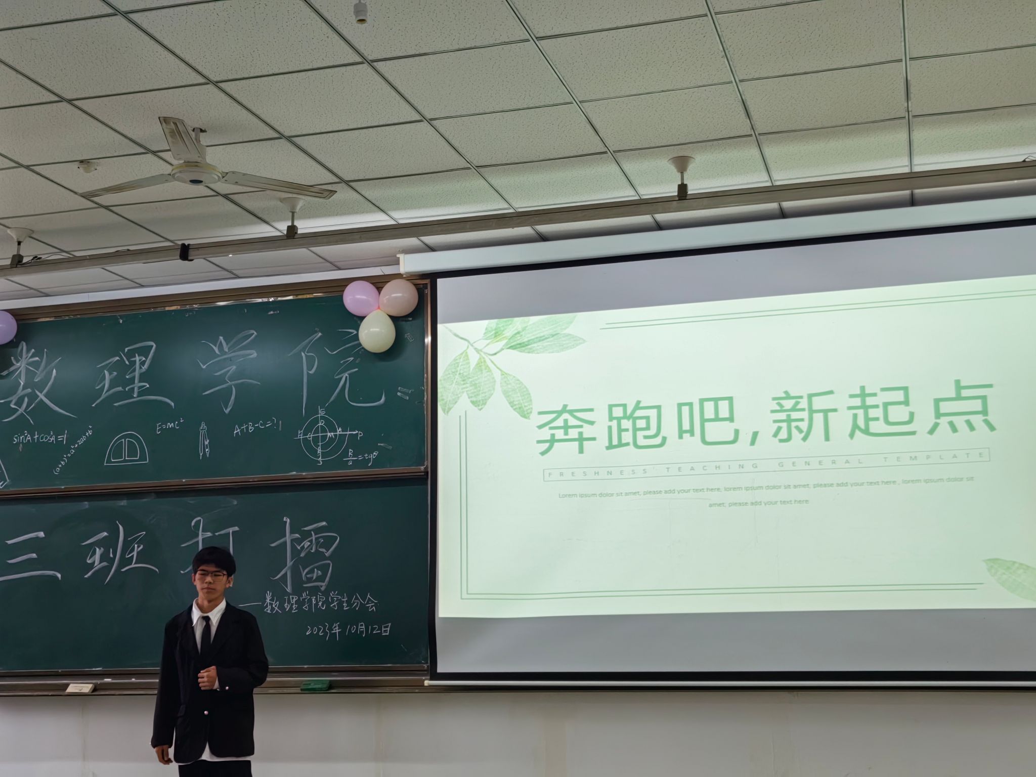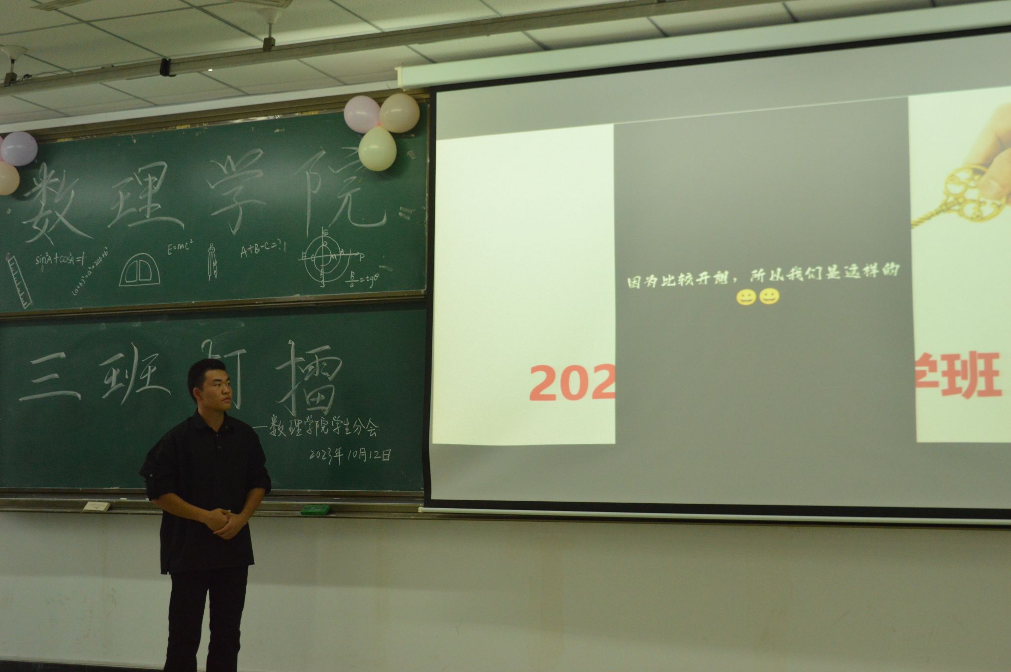 本网讯(文/佘飞扬 图/张淑婷)为学习贯彻落实党的二十大精神,丰富同学们的校园文化生活,展现我院新生班级风采,引导我院全体学生进一步理解“明德善思,知数达理”的院训,促进学风建设。10月12日下午,数理学院在行知楼开展了“三班打擂”活动。数理学院23级辅导员曹琳和学生分会、分团委、传媒中心主要学生干部担任评委,2023级各班学生代表参加活动,活动由王硕和张诗雨主持。