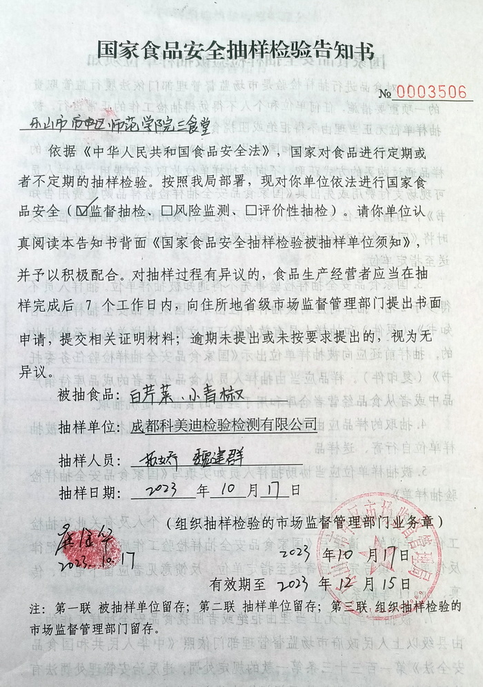 本次抽检工作由第三方检测机构成都科美迪检验检测有限公司具体实施,本次抽检的品类为我校食堂使用的食用农产品,包括采购的茄子、豇豆、芹菜等各种蔬菜。