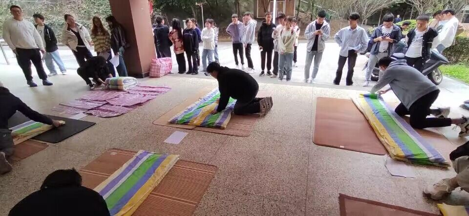 比赛正式开始,选手们分组依次上场,参赛选手们动作娴熟,快中求稳,每个细节都相当到位。在规定的时间内,每一位同学都将手中的军被叠成相对规范的“豆腐块”形状。评委们依据参赛选手的现场表现依次进行打分。