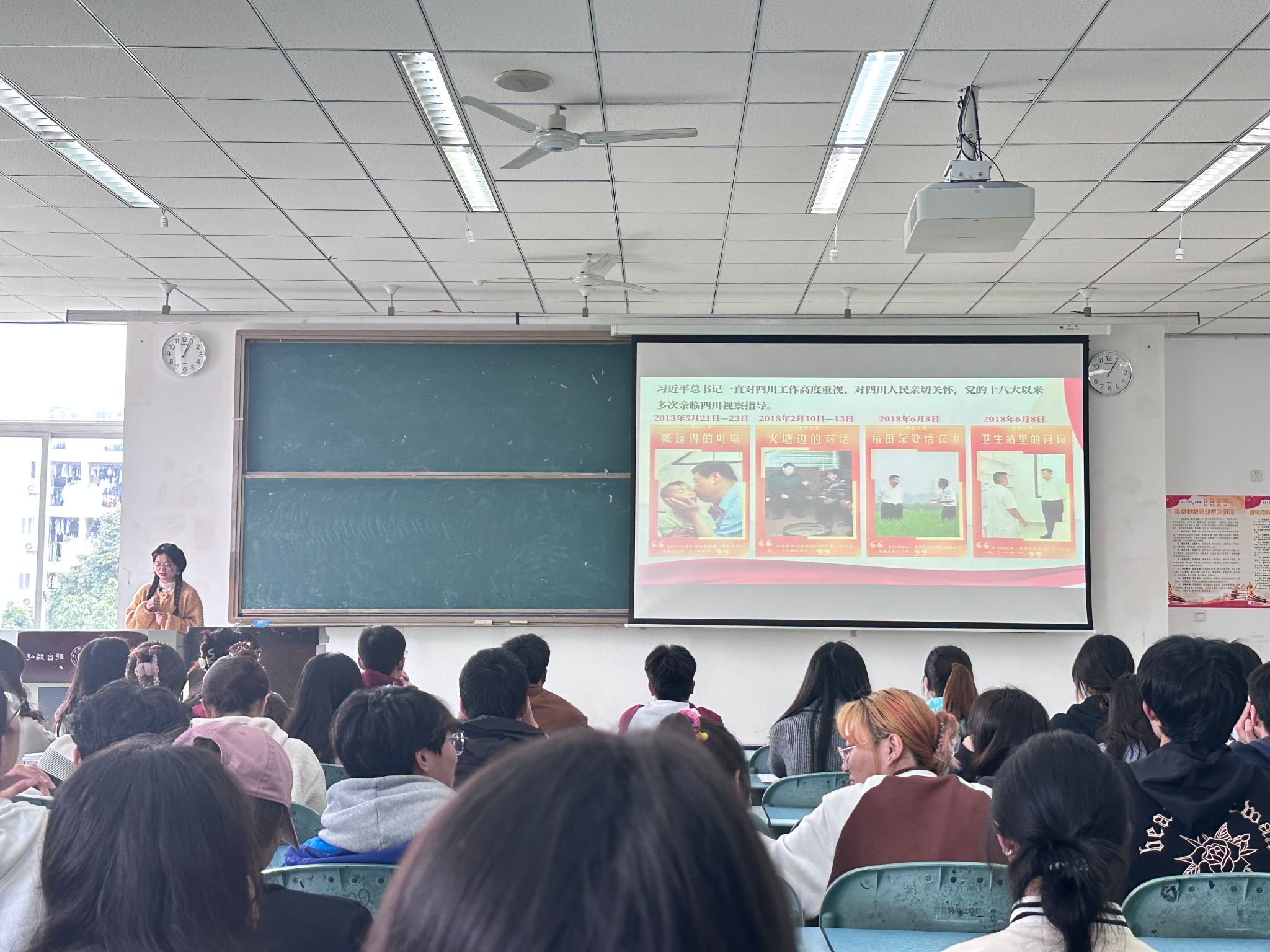 文雯以党的十八大以来习近平总书记亲临四川视察指导引入本次主题,结合PPT、视频等带领同学们领略三星堆遗址的底蕴,了解三星堆遗址发掘历程和古蜀文明成果,详细阐述了习总书记指示精神背后的丰富内涵以及对青年的实践要求,号召青年大学生深刻领会习近平总书记重要指示的丰富内涵和核心要义,领会把握习近平总书记对四川工作给予的充分肯定,更加自觉地立足四川、服务全局,更加信心百倍地走好新的赶考之路。