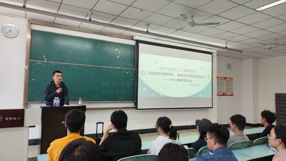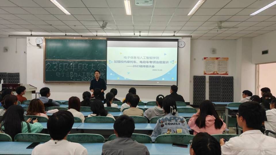 本网讯(文/李美莹 图/曾月霞)10月22日,电子信息与人工智能学院在行知楼101、114、225、301、314召开了年级大会暨校内摩托车、电动车专项治理宣讲会、华为ICT大赛及华为认证交流会。本次大会邀请华为ICT大赛及华为认证老师陆海兵、张大新。电子信息与人工智能学院分团委书记强光平、辅导员雷雄锴、狄红霞主持,21级、22级、23级全体学生共同参与。