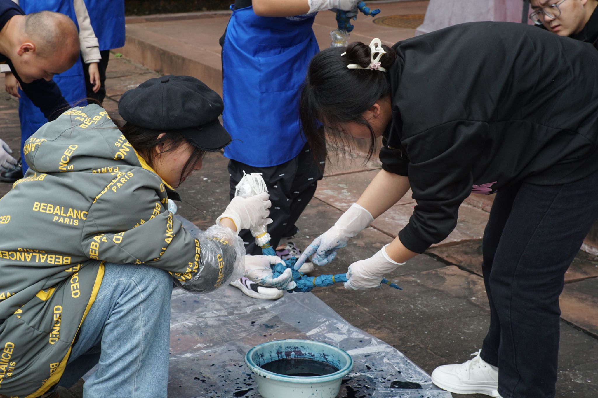 美术与设计学院“由染而生”非遗传播服务团队的6名成员在指导教师王永清的带领下,为50名体验者提供了扎染研学体验服务。活动中,志愿者们参与了原材料准备、场地布置、组织教学、实践辅导等工作,热情周到地为体验者服务,让研学活动有序开展,圆满完成研学任务,受到主办方好评。本次活动让更多的人与峨眉扎染近距离接触,感受优秀传统文化所带来的独特魅力和艺术价值,树立文化自信。