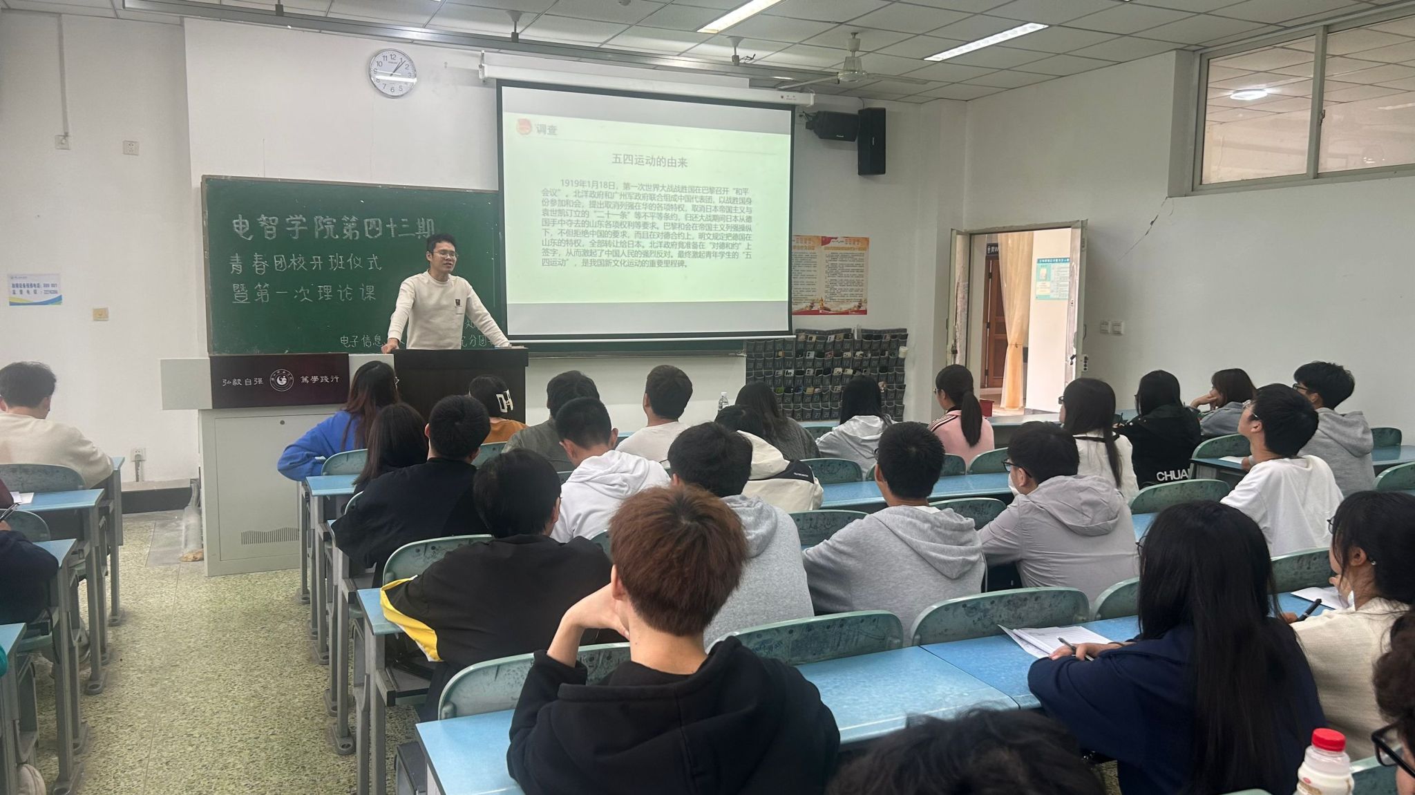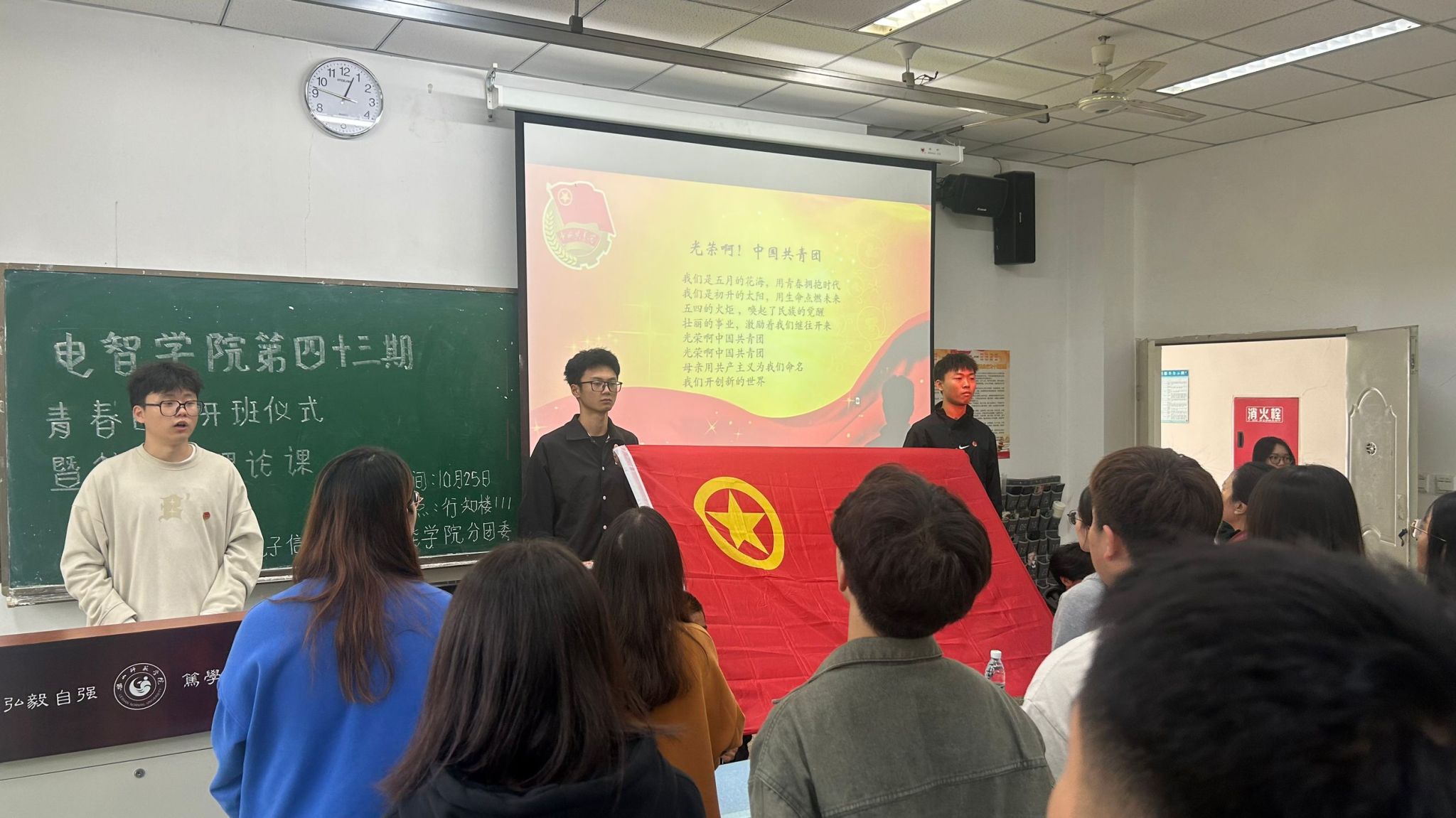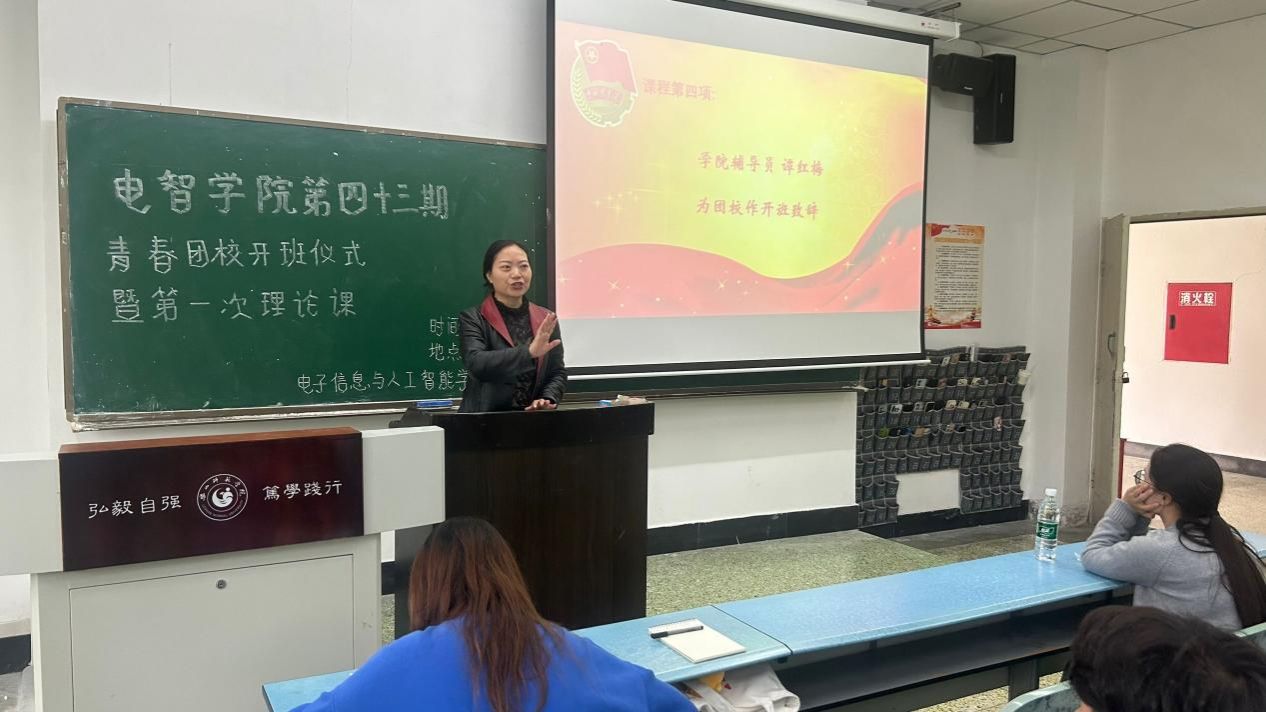 本网讯(文/陈江 图/母傑)10月25日,电子信息与人工智能学院在行知楼111组织开展第四十三期青春团校开班仪式暨第一次理论课。此次课程的开设,旨在引导广大团员青年坚定理想信念,增强爱国情怀,提高思想政治素质。辅导员谭红梅、雷雄锴、肖苗、狄红霞,组织部部长吴佳旺和全体团课学员共同参与。