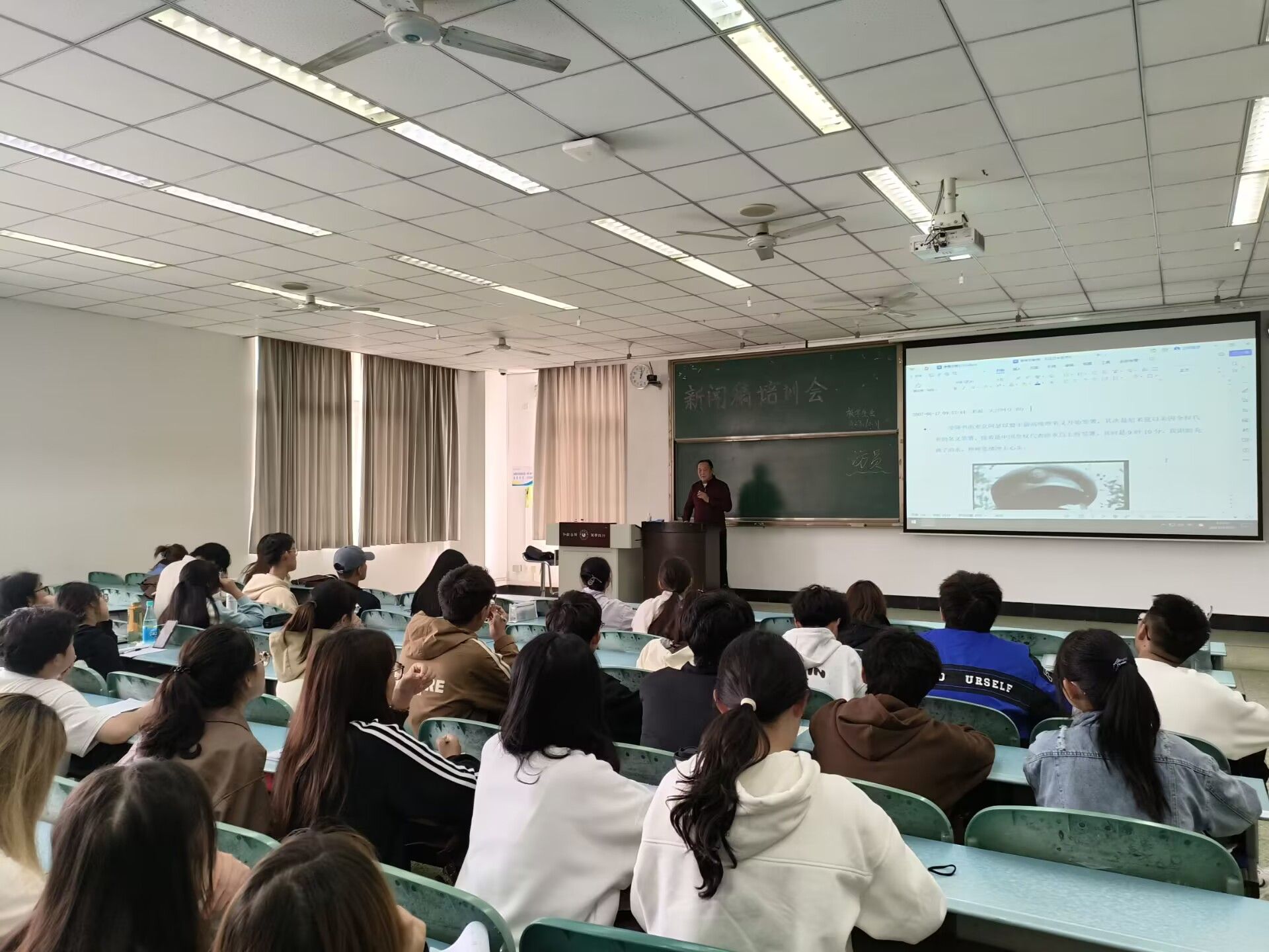 培训会伊始,李康云从新闻记者的发展历史入手,用生动的语言和丰富的实例,向在座同学讲授新闻稿写作的内涵。李教授指出,生活在信息爆炸的时代,我们需要对假新闻的鉴别能力;需要对真相敏锐的洞察力;需要不被表面的现象所迷惑;也需要学会语言表达的艺术。