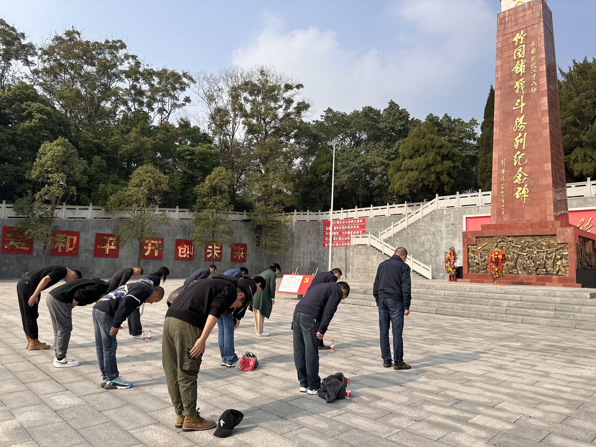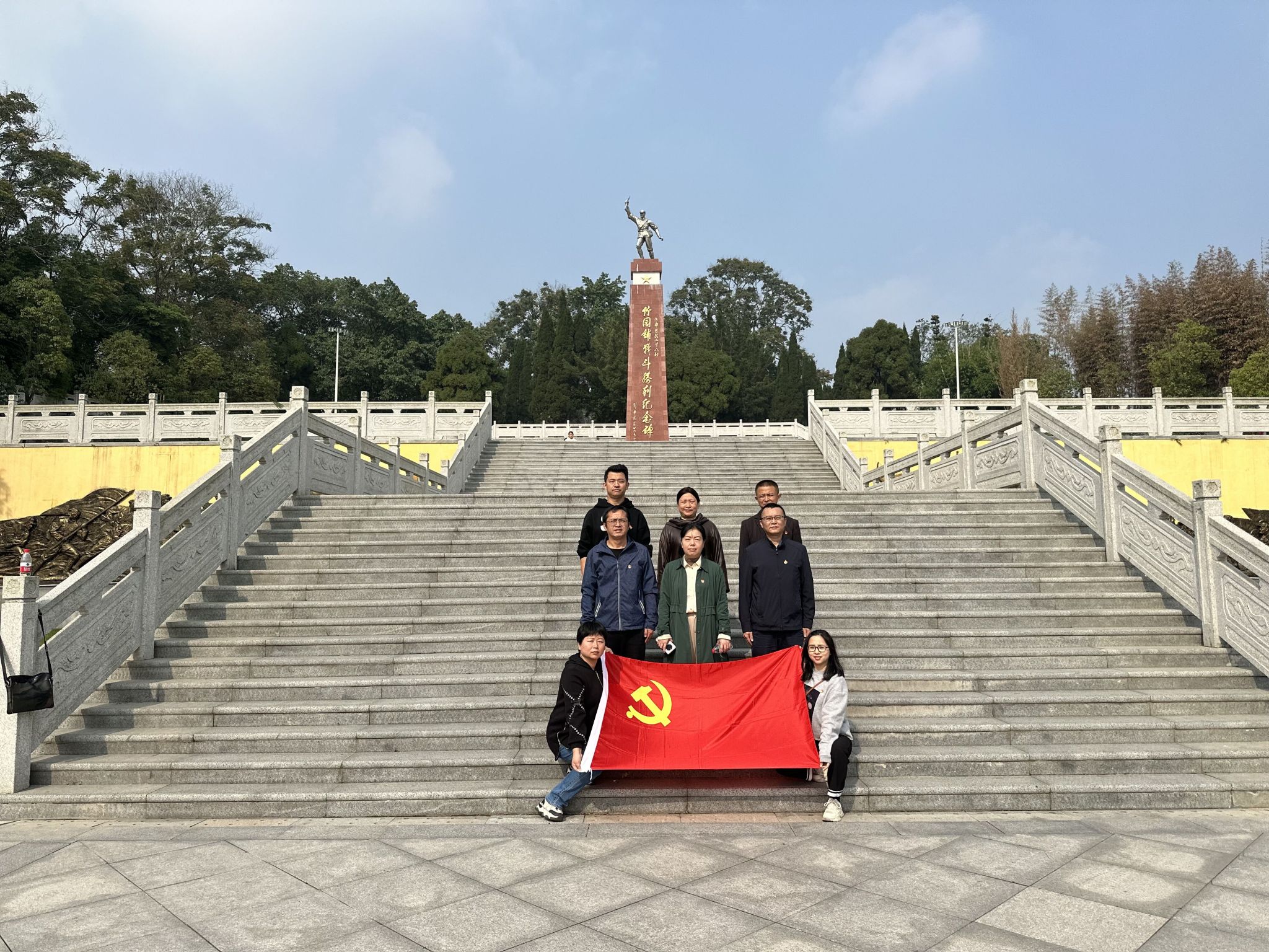 在宏伟庄严的竹园铺战斗胜利纪念碑前,全体肃立,齐唱《中华人民共和国国歌》,重温入党誓词。