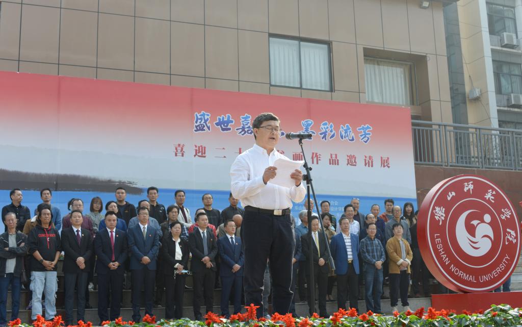 嘉州画派研究院院长李开能介绍了画展筹备情况,市文联主席罗国雄代表乐山市文联致辞,四川开明画院院长杨晓亮代表参展艺术家致辞;校长刘进代表卡塔尔世界杯决赛波胆预测 致辞,感谢艺术家的精心创作,用书画展与全国人民一道共同庆祝党的二十大胜利召开,他肯定这次画展是世界杯葡萄牙vs加纳波胆预测 的一次公共美育活动,是卡塔尔世界杯决赛波胆预测 美育的一道亮丽的风景线。党委书记胡丹宣布此次画展开幕。